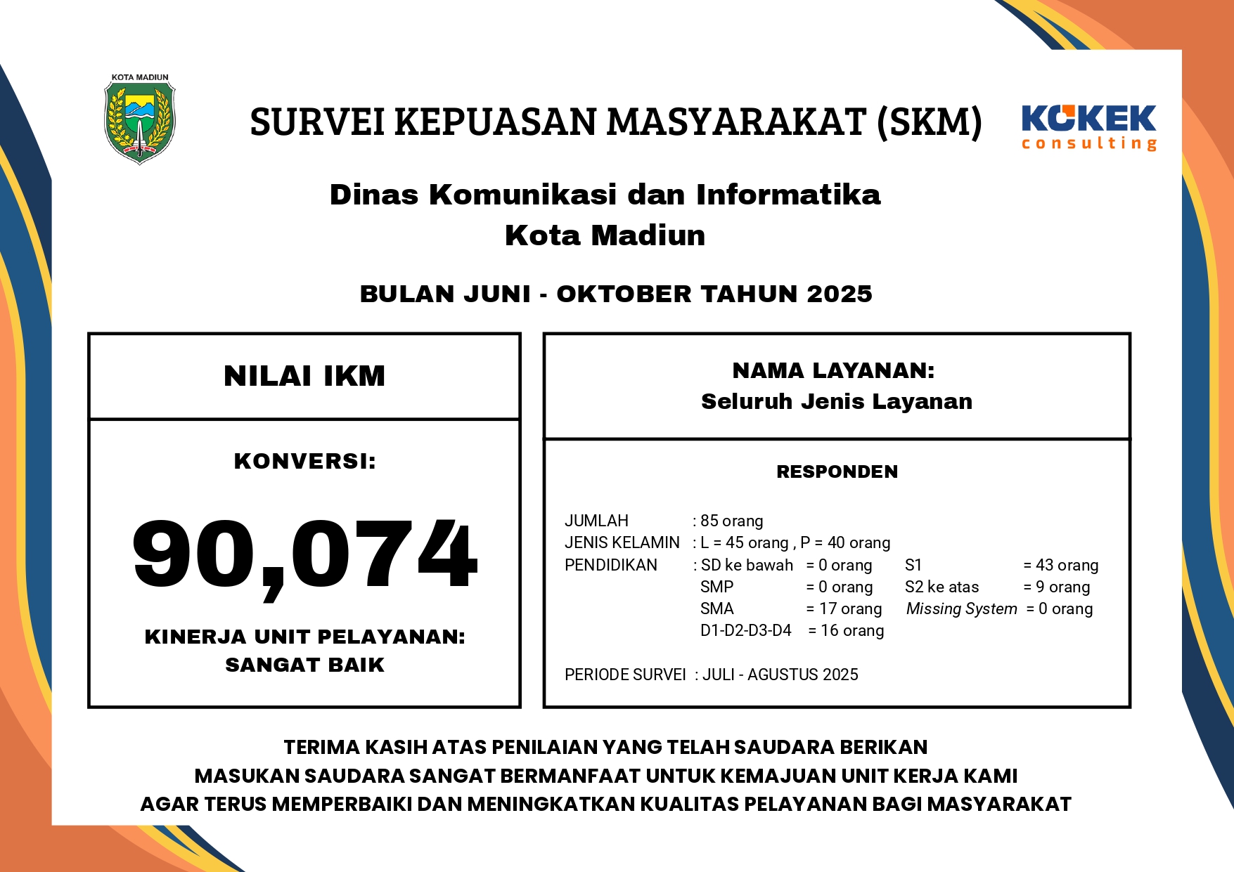 Dilihat dari laporan hasil evaluasi implementasi Smart City pada semester II 2023, Kota Madiun meraih nilai 3,71 dan menempati urutan ketiga tertinggi nasional setelah Surakarta dan Bandung. Bahkan, nilai Kota Madiun lebih tinggi dari Semarang dan Surabaya yang sudah menerapkan program ini lebih awal.