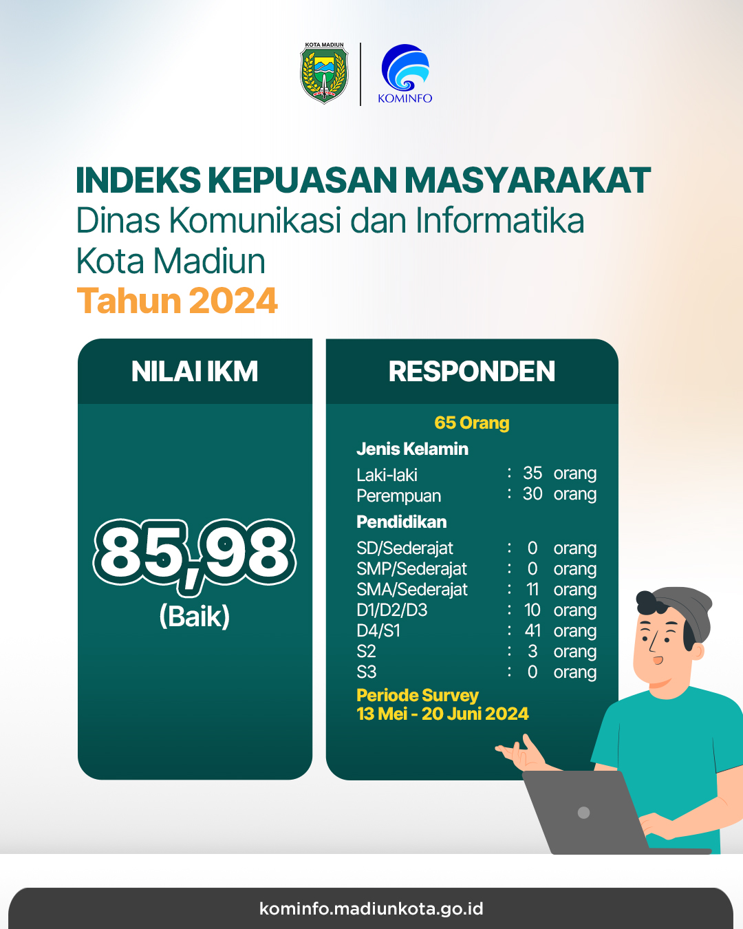Diskominfo Kota Madiun berupaya untuk terus meningkatkan pelayanan kepada masyarakat, pada tahun 2023 Diskominfo mendapatkan nilai IKM 85,09 dan pada tahun 2024 meningkat menjadi 85,98.